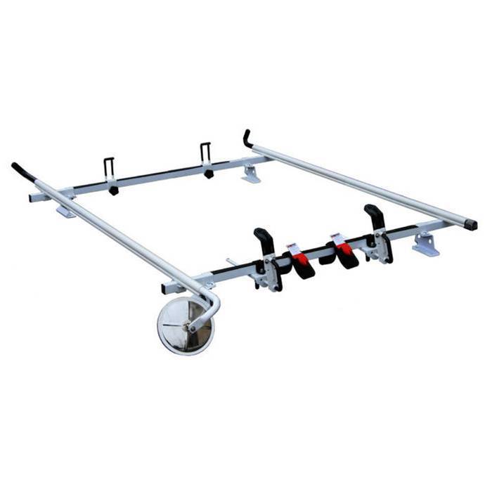 The Aluminum M4000 is a universal rack system that can be installed on any vehicle with or without drip rails (drilling required). The cross bars are arched for easy ladder access.The mounting bases are 3 mm thick and have an extra wide 6in X 1.5in mounting base, polyfoam gasket and 6in X 2in interior plate secures the rack system onto the vehicle.This system weighs in at 14 lb. with stainless steel hardware. Max load capacity of this system is 500 lb. for a 2 bar system. To aid in loading and unloading of material handle (bullhorn) is placed on both the driver side and passenger side and a convex can be installed to let you see just what is behind you. Accessories included (2 Side Rails to prevent items from sliding off vehicle.)(1 X 5in Ladder Guide: Separate material and ladders and allow for easy tie down.)(4 X 5in Side Support: Prevent material from falling off the sides.)(2 X 5in Ladder Stopper: Prevent ladders from sliding forward.)(2 X Push 2 Secure: Locking system that secures ladders in place simply by pushing handle against ladder steps. Rubberized and adjustable from 5in-8in tall)(2 X EZ Velcro Strap: Secures ladders in place within seconds.)(Easy turn knob: Adjust ladder stoppers and ladder guides.)